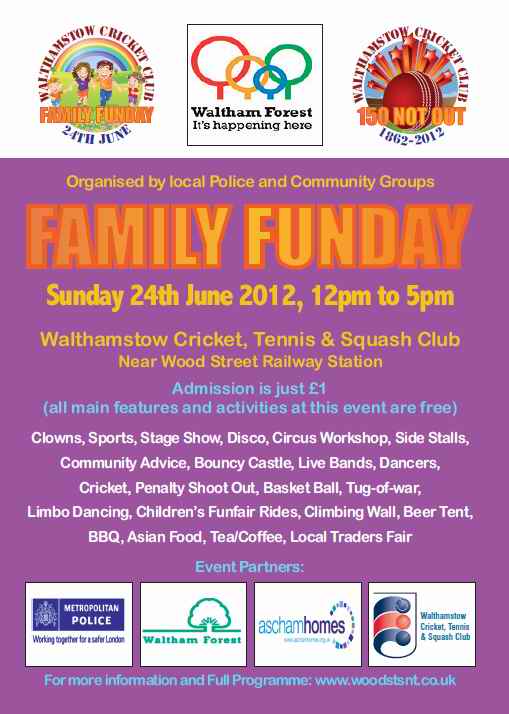The Wood Street Family Fun Day is being held on Sunday, June 24th June 2012 at Walthamstow Cricket, Tennis & Squash Club in Greenway Avenue (around the corner from Wood St station).