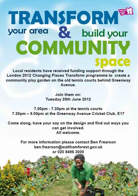 Local residents have secured funding to create a community play garden in the Wood Street area. Next Tuesday (26th June) local residents have the chance to find out more about the project, give their views and get involved. The funding is from the London 2012 Changing Places Transform programme, and has been secured with help from London Borough of Waltham Forest Green Space Service.
