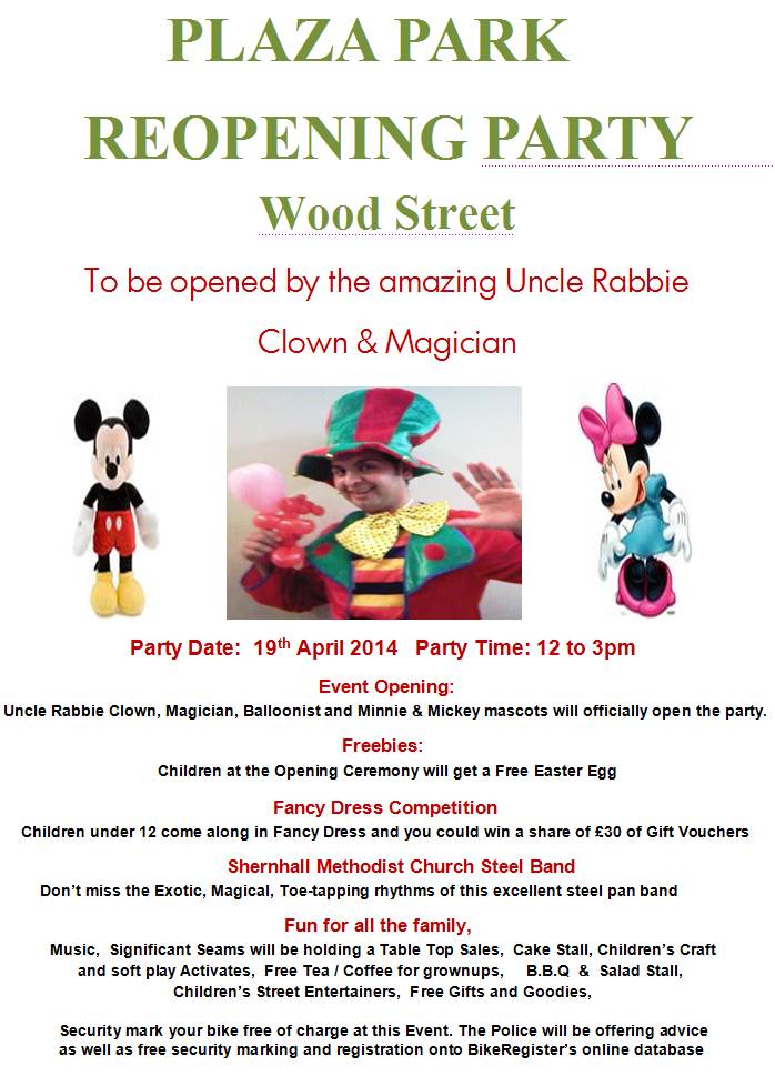 The good news is that, after a long wait, the refurbished Wood Street Plaza park and play area will be re-opened on Saturday 12th 19th April 2014. Please note the date change!