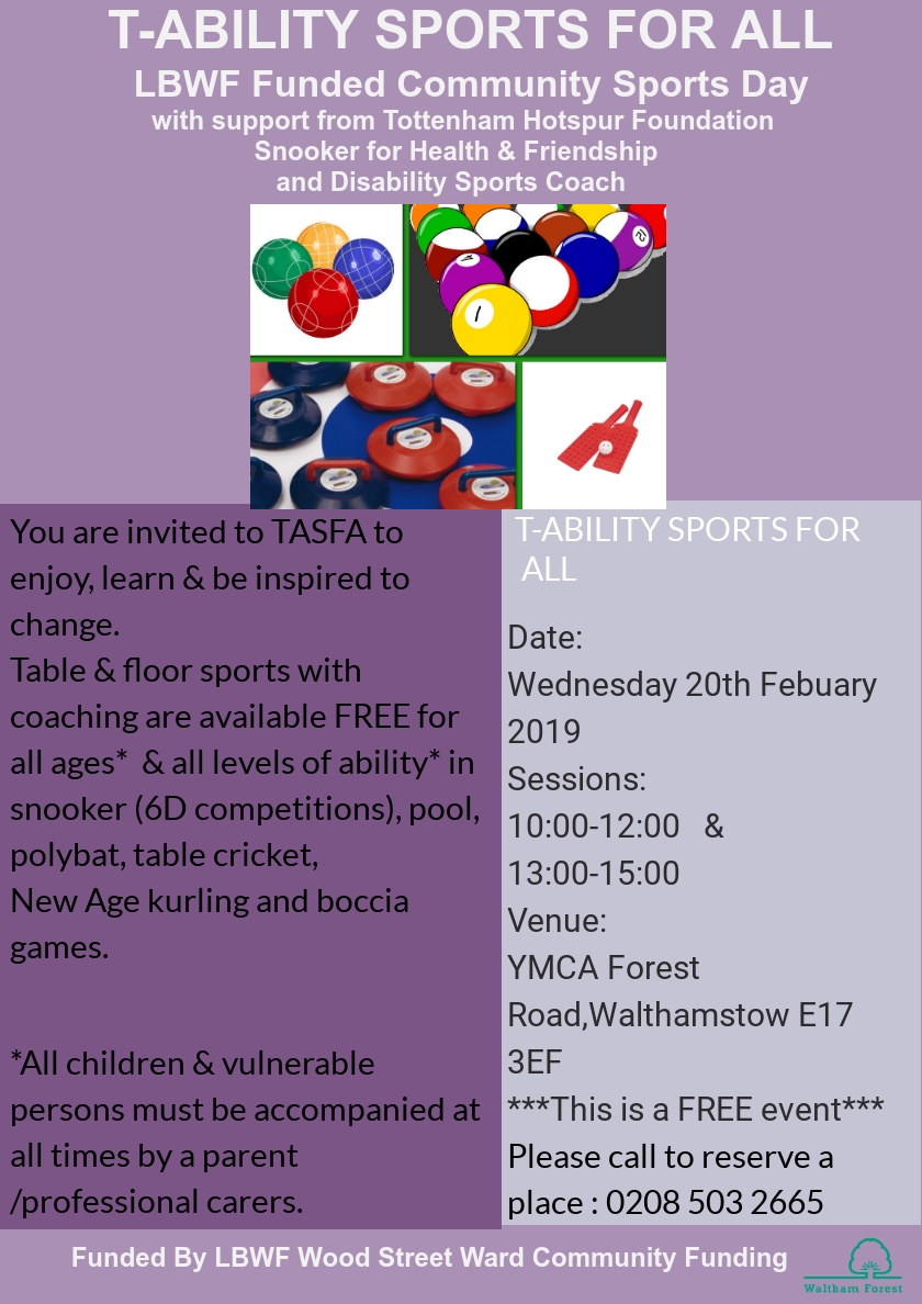 This community sports day will be hosted by T-Ability Sports For All . In 2 sessions on Wednesday 20th February. See below for more details.
