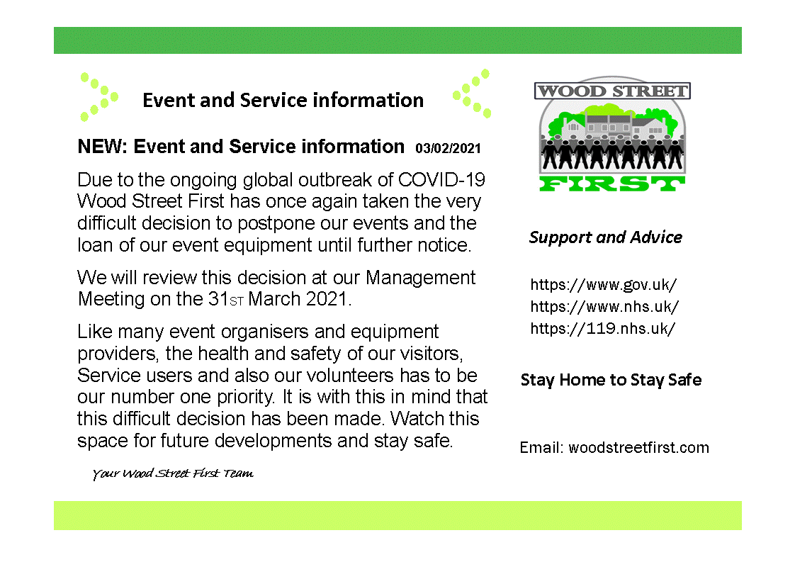 11 Feb 212112 Feb 2121 by woodstwp Covid-19 – Update. Please see below what the current position is in what Wood Street First are doing: 11.02.2021 Share this: Click to share on X (Opens in new window) X Click to share on Facebook (Opens in new window) Facebook Like Loading... Related