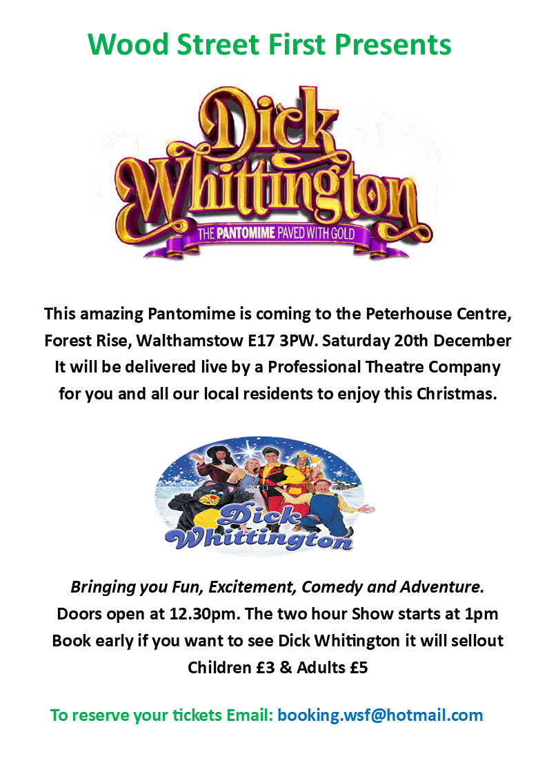 29 Nov 252529 Nov 2525 by woodstwp PANTO TIME IN UPPER WALTHAMSTOW. Wood Street First, in conjunction with a professional theatre company, are hosting a Pantomine this December at Peterhouse on Saturday 20th December 2025. Please see below for more details of how to book. Christmas 2025 Panto in Upper Walthamstow. 29.11.2025 Share this: Click to share on X (Opens in new window) X Click to share on Facebook (Opens in new window) Facebook Like Loading... Related